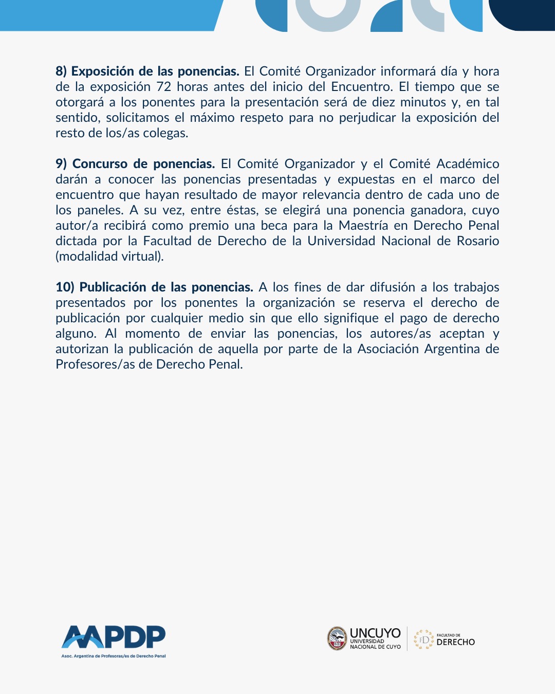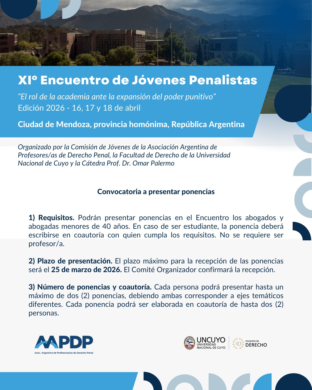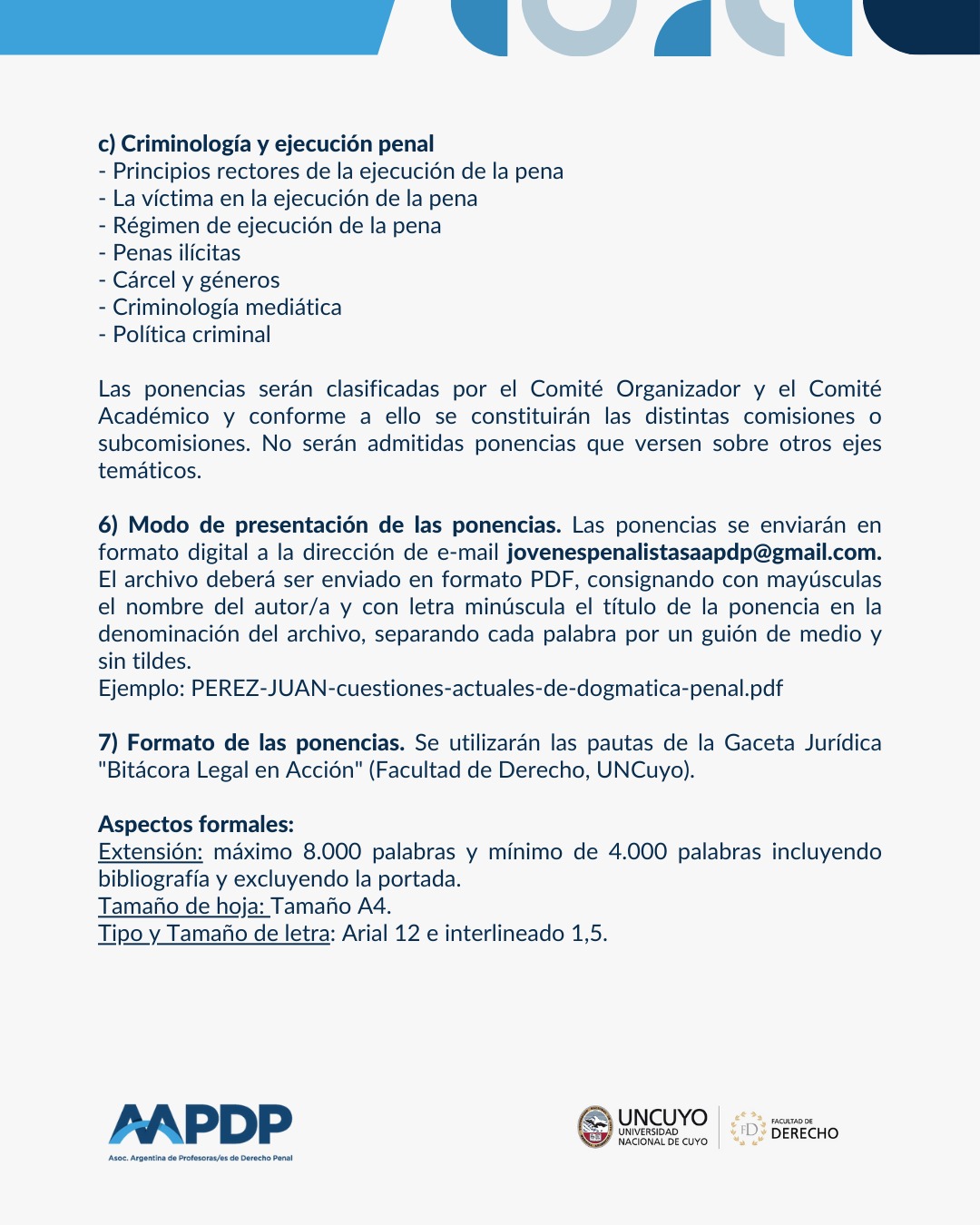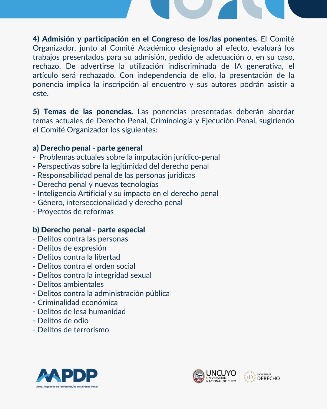 2025-12-16 Compartir Publicaciones relacionadas2025-12-16Convocatoria «Escuela Internacional de Derecho Penal» organizada por la Universidad de Calabria (Italia) y la AAPDPLeer más2025-12-11Democratizar la reforma penalLeer más2025-06-03Reseña del X Encuentro Jóvenes Penalistas AAPDPLeer más